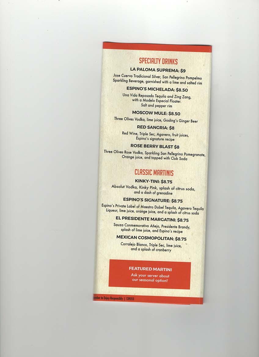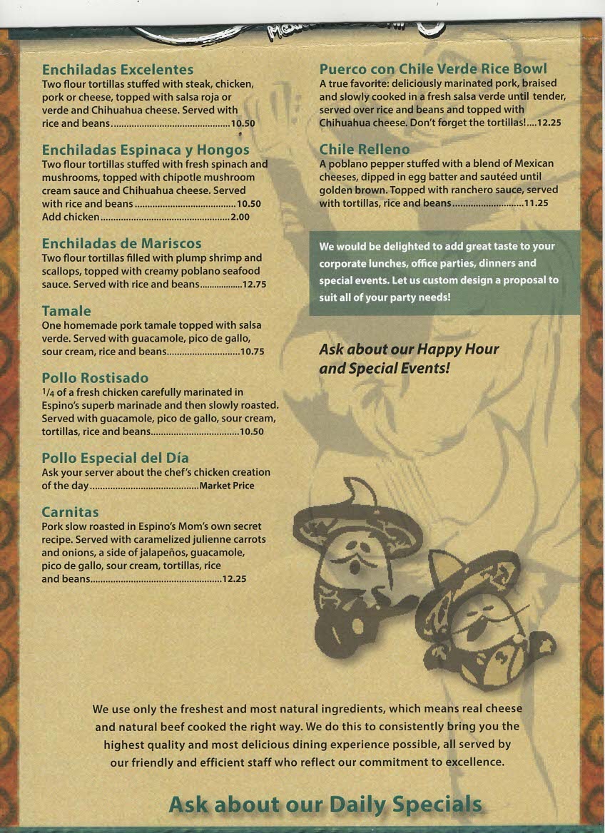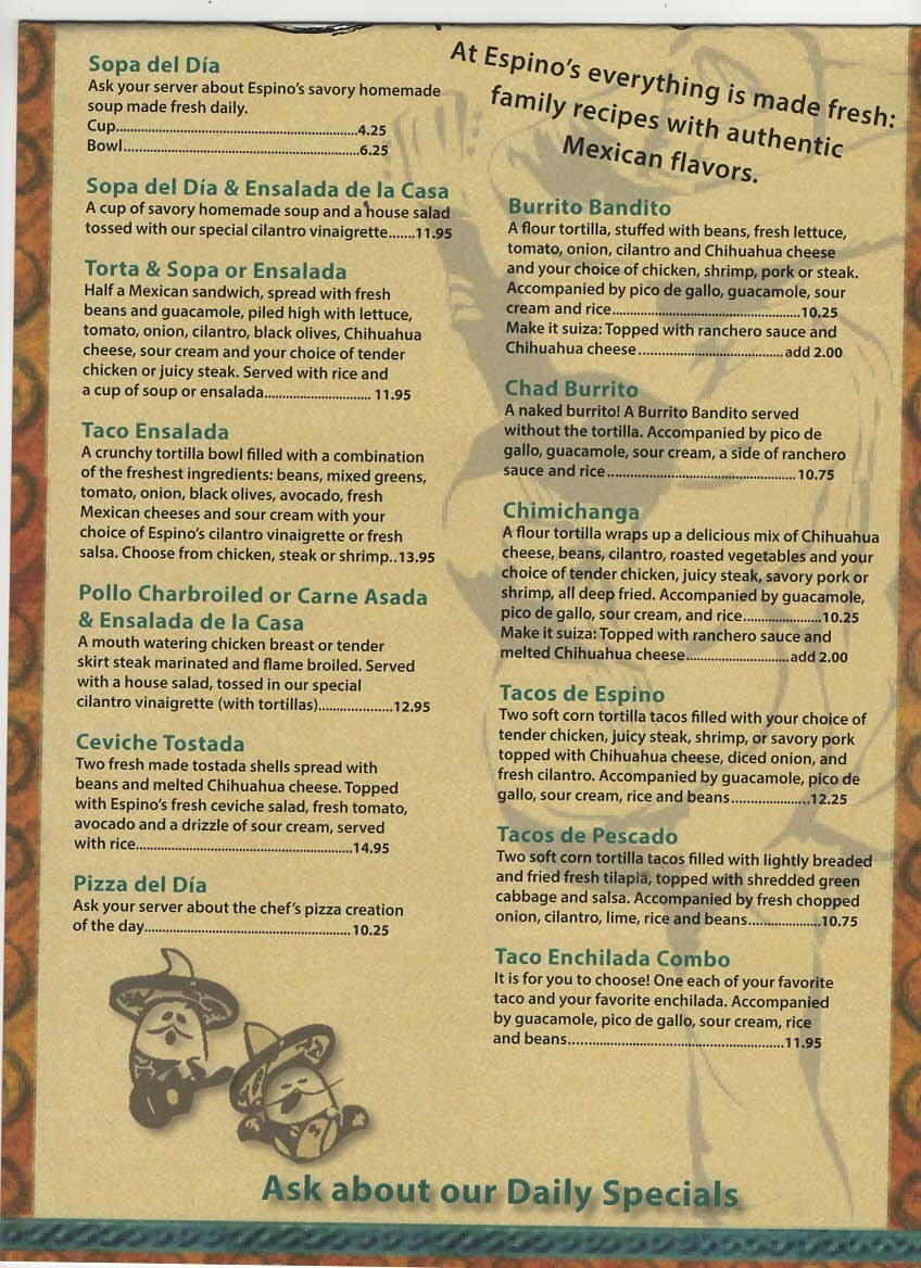 Welcome to Espino's Mexican Bar & Grill, a vibrant dining destination nestled in Chesterfield, MO. This authentic eatery serves a delectable array of Mexican cuisine that is sure to satiate any craving. Highlights of the menu include the renowned Puerco Chili Verde, a dish celebrated by Guy Fieri, and Bisteca Mexicana featuring tenderloin tips that will tantalize your taste buds.